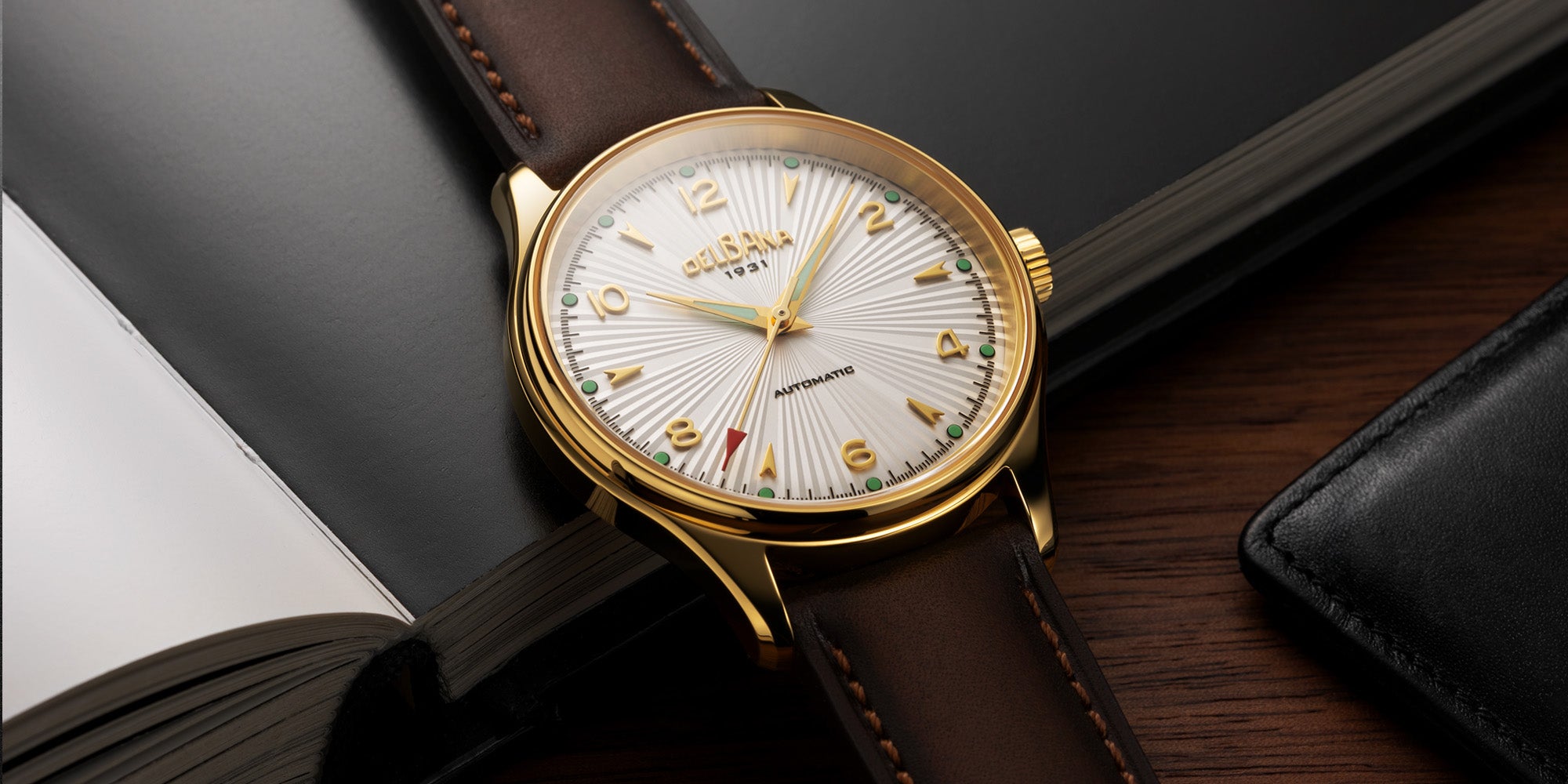 The polished yellow gold PVD stainless steel case frames a silver sunburst guilloché pattern dial, enhanced by applied arrow-shaped indexes and Arabic numerals. The historic Delbana logo at 12 o’clock and the absence of a date window reinforce its vintage character.