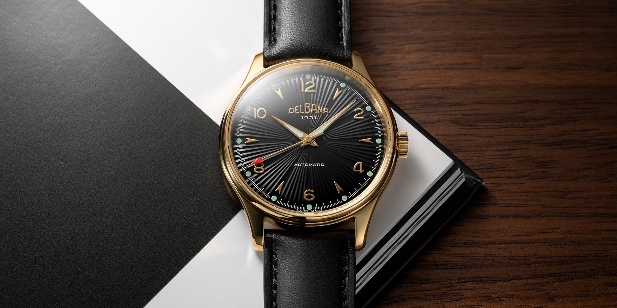 The polished yellow gold PVD stainless steel case frames a black sunburst guilloché pattern dial, enhanced by applied arrow-shaped indexes and Arabic numerals. The historic Delbana logo at 12 o’clock and the absence of a date window reinforce its vintage character.